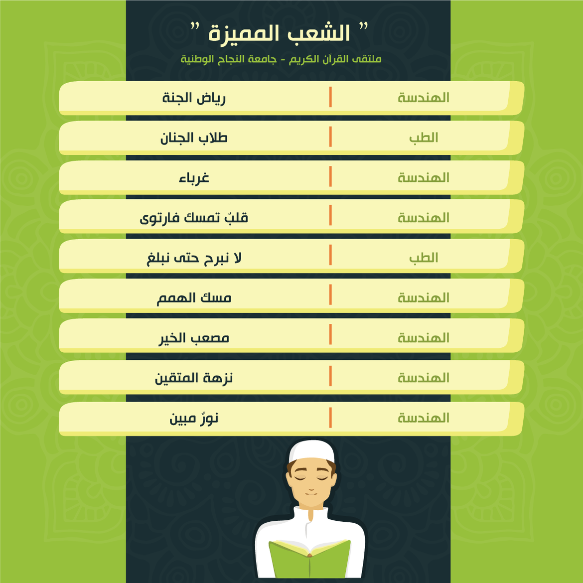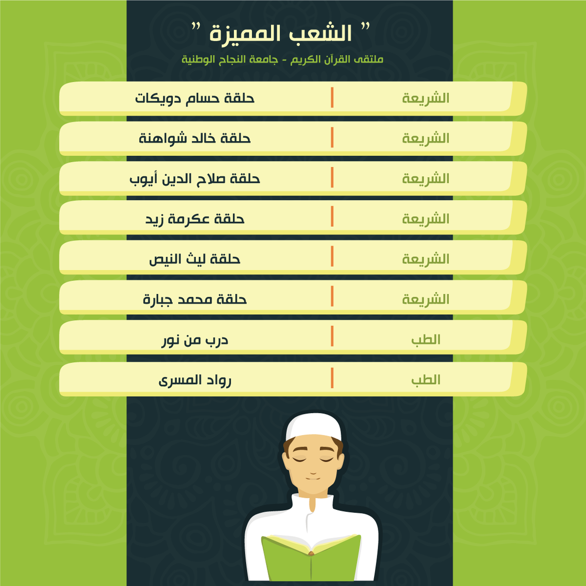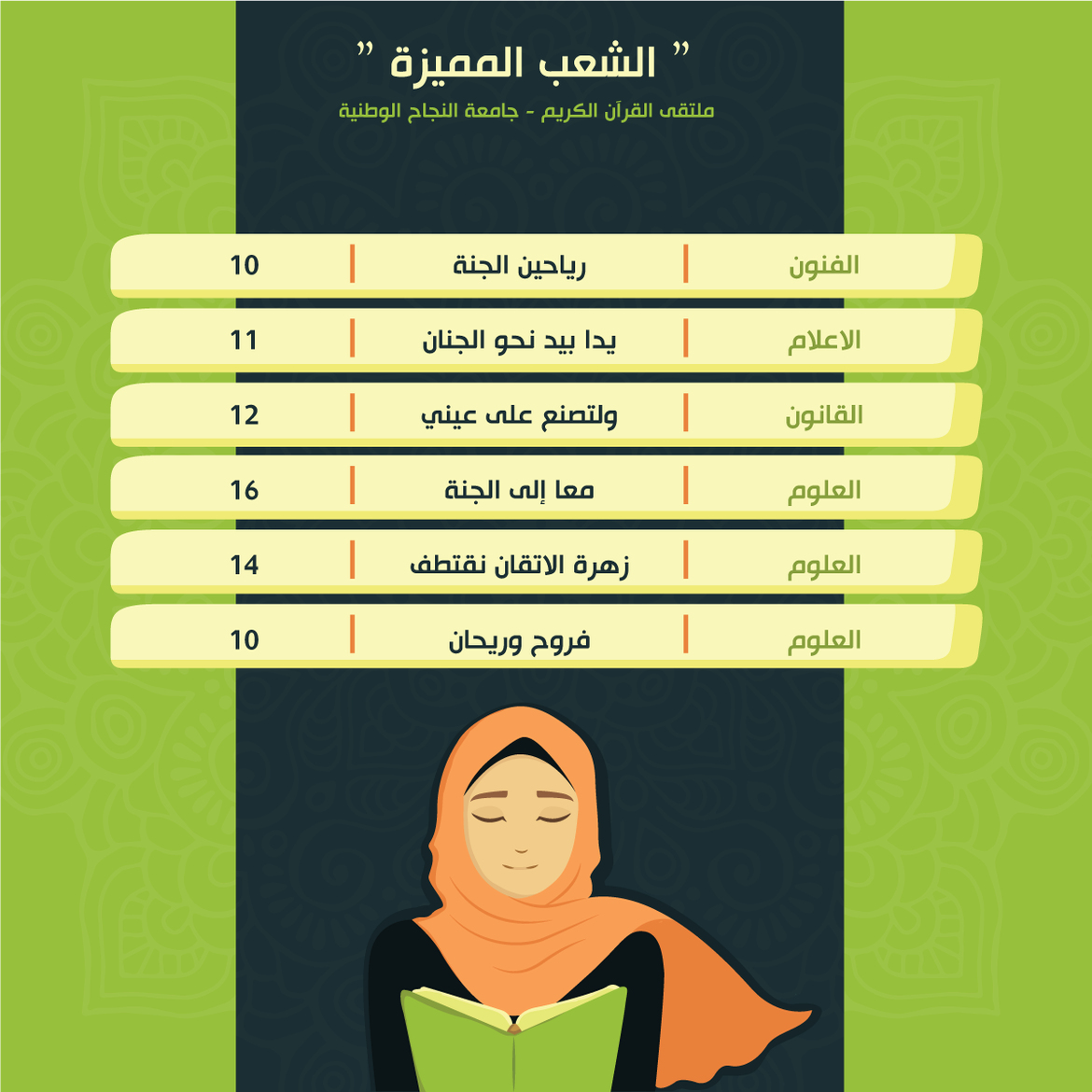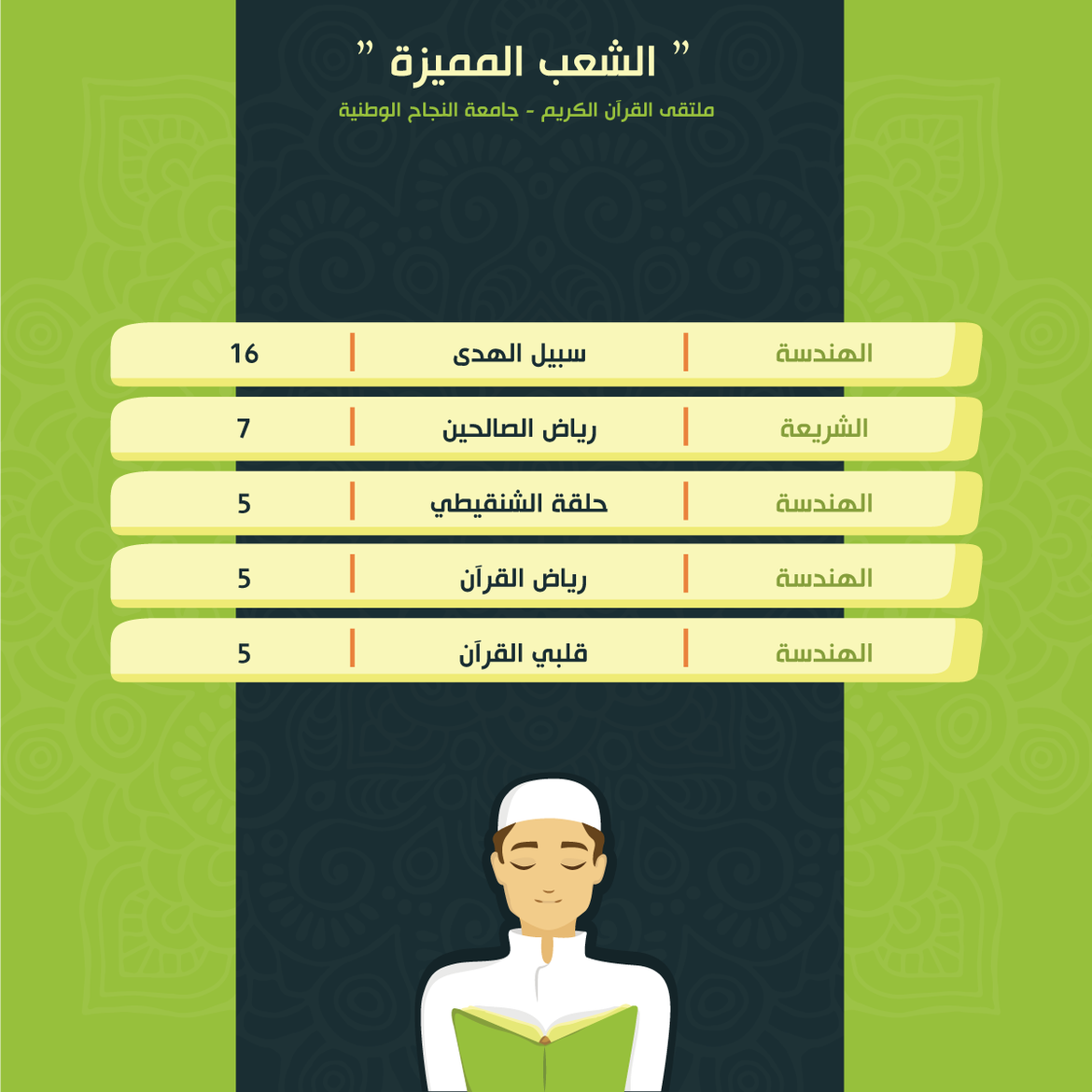 ضمن أنشطة الملتقى الهادفة لرعاية حفظ القرآن الكريم ضمن حلقات التحفيظ، جاءت نتائج حصاد الشعب المميزة للأسبوع الثاني عشر والثالث عشر من الفصل الثاني للعام 2020/2021 كالتالي: