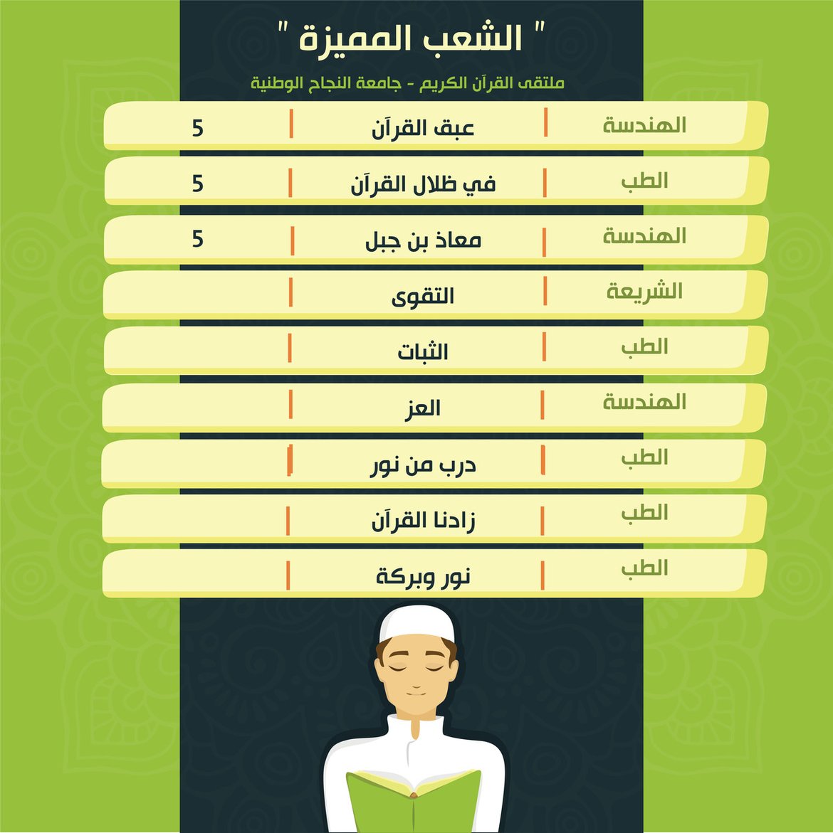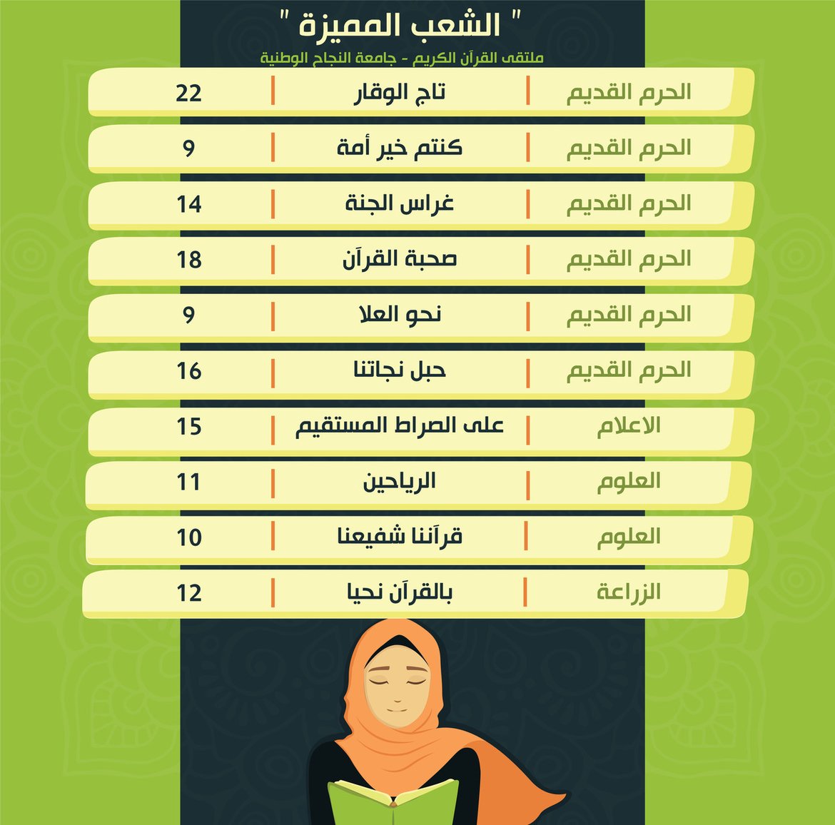 ضمن أنشطة الملتقى الهادفة لرعاية حفظ القرآن الكريم ضمن حلقات التحفيظ، جاءت نتائج حصاد الشعب المميزة للأسبوع الخامس من الفصل الثاني للعام 2021/2022، كالتالي: السابق التالي عدد القراءات: 402