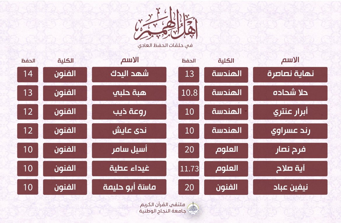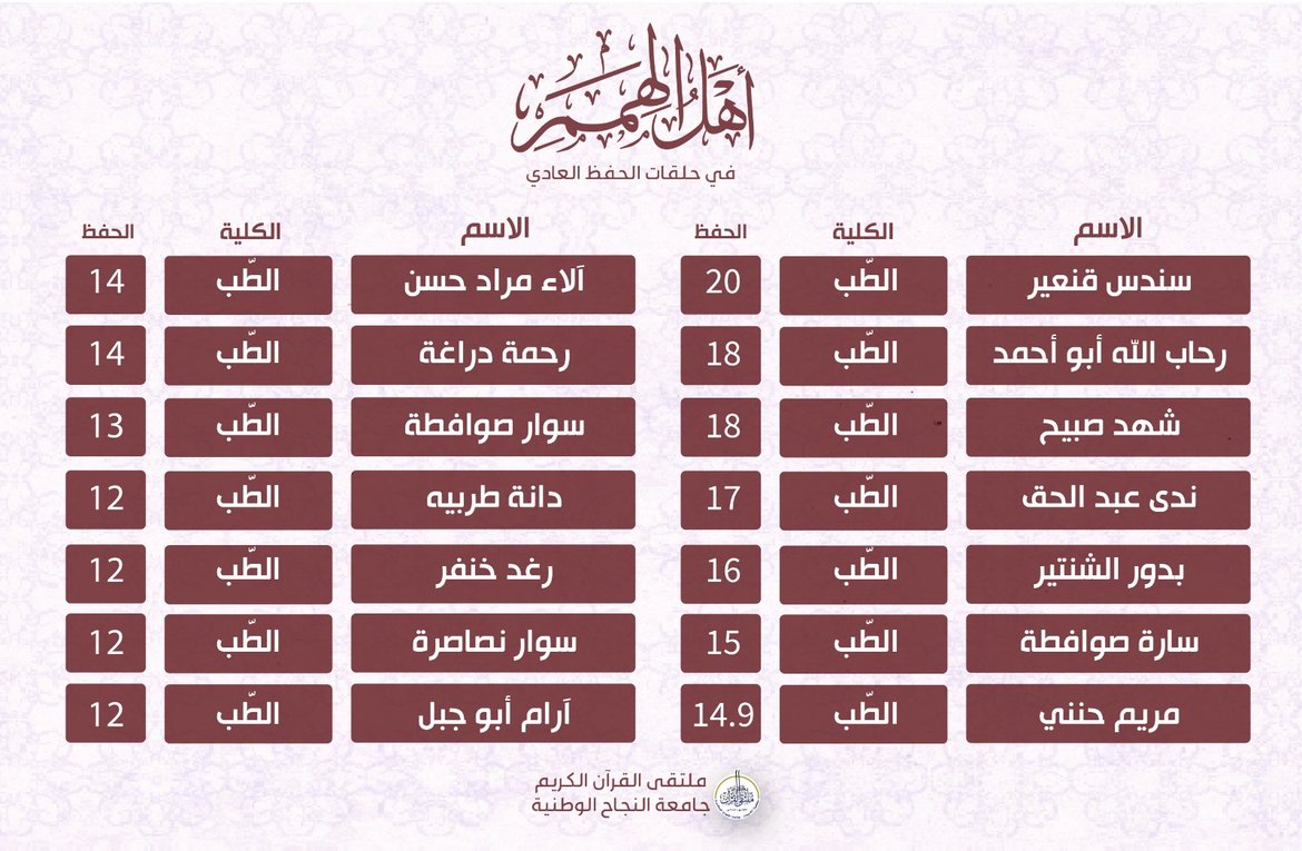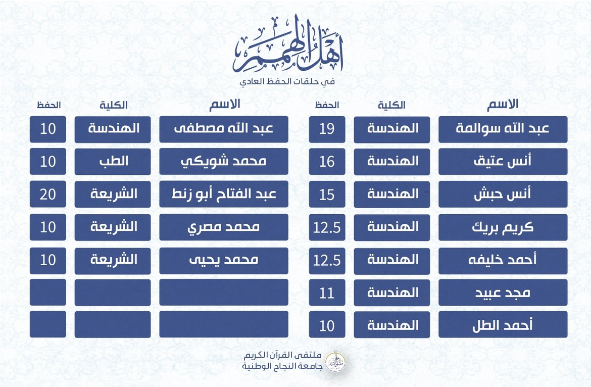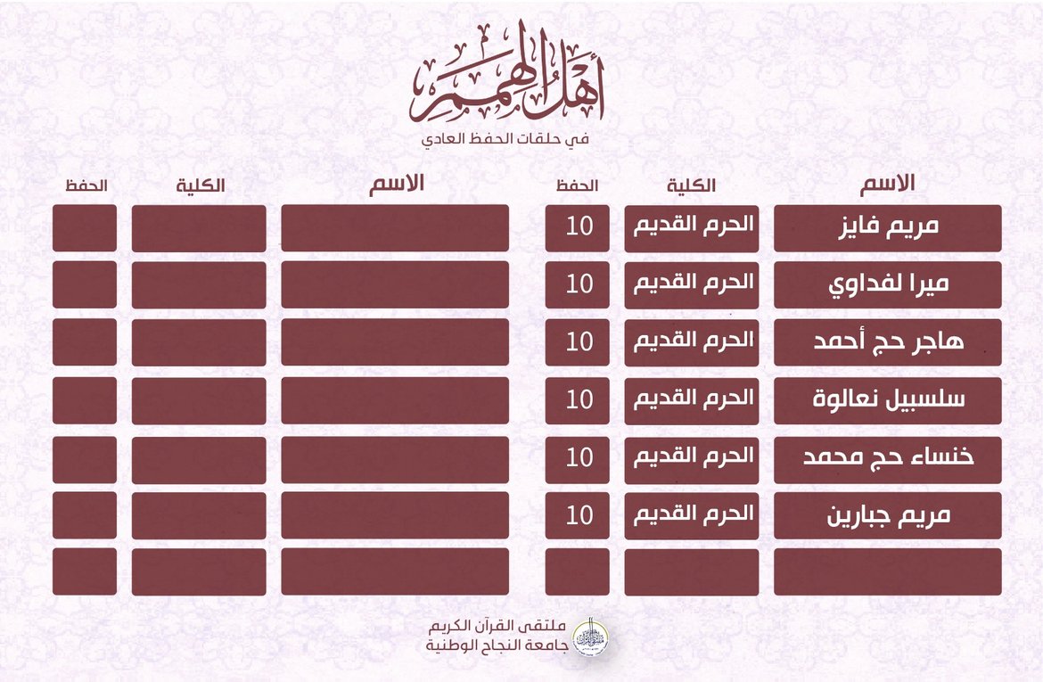 ضمن أنشطة الملتقى الهادفة لرعاية حفظ القرآن الكريم وضمن حلقات التحفيظ، جاءت نتائج الحفظ للأسبوع الرّابع من الفصل الدّراسيّ الأوّل للعام 2025-2026 كالتالي: