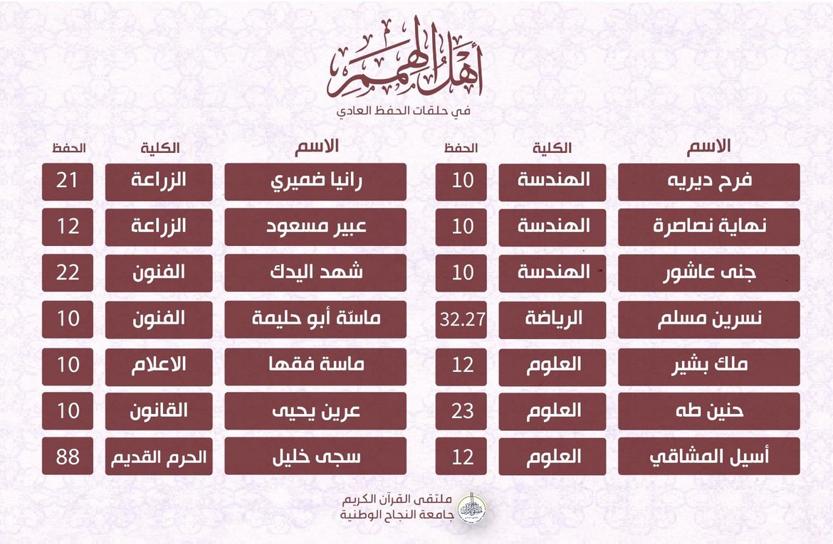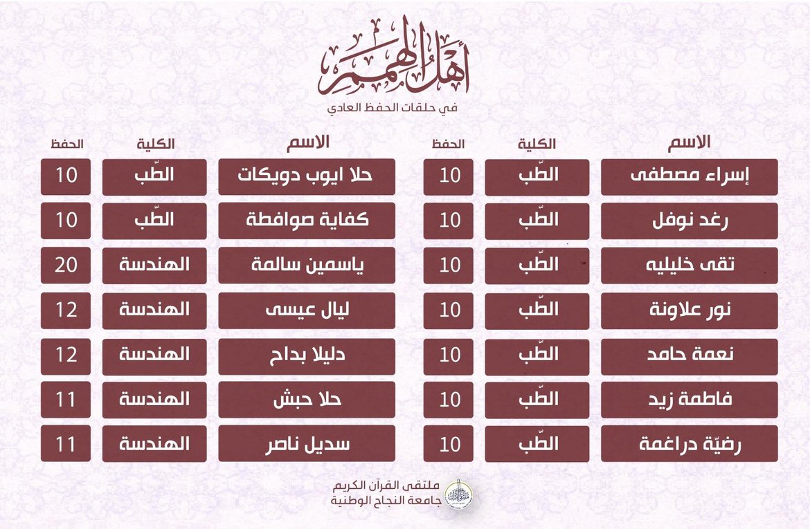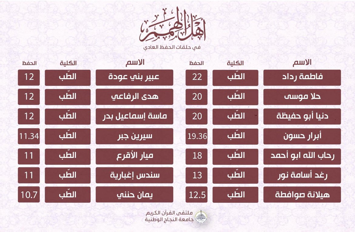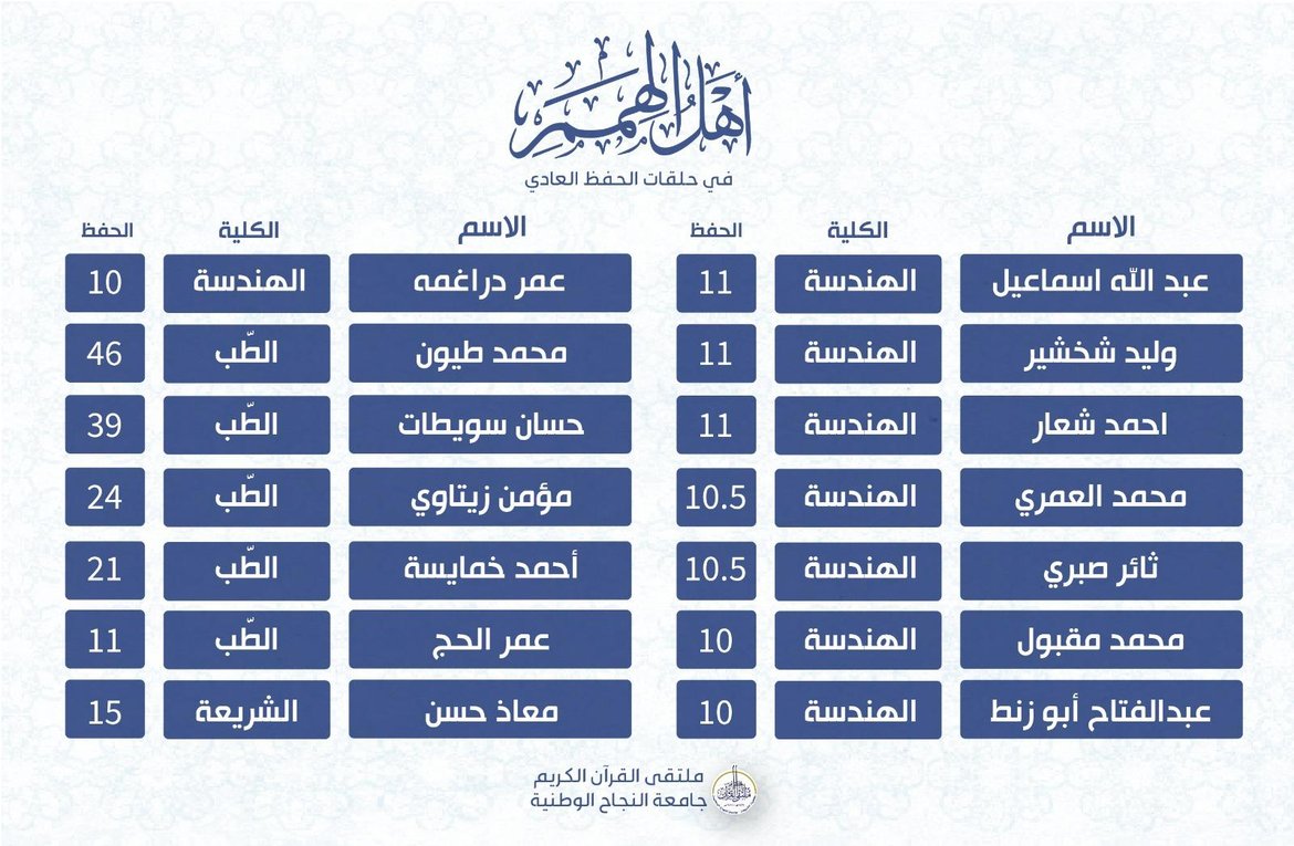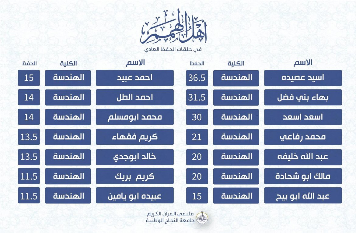 ضمن أنشطة الملتقى الهادفة لرعاية حفظ القرآن الكريم وضمن حلقات التحفيظ، جاءت نتائج الحفظ للأسبوع الخامس من الفصل الدّراسيّ الأوّل للعام 2025-2026 كالتالي: