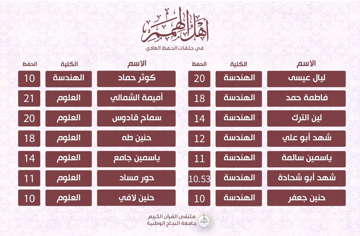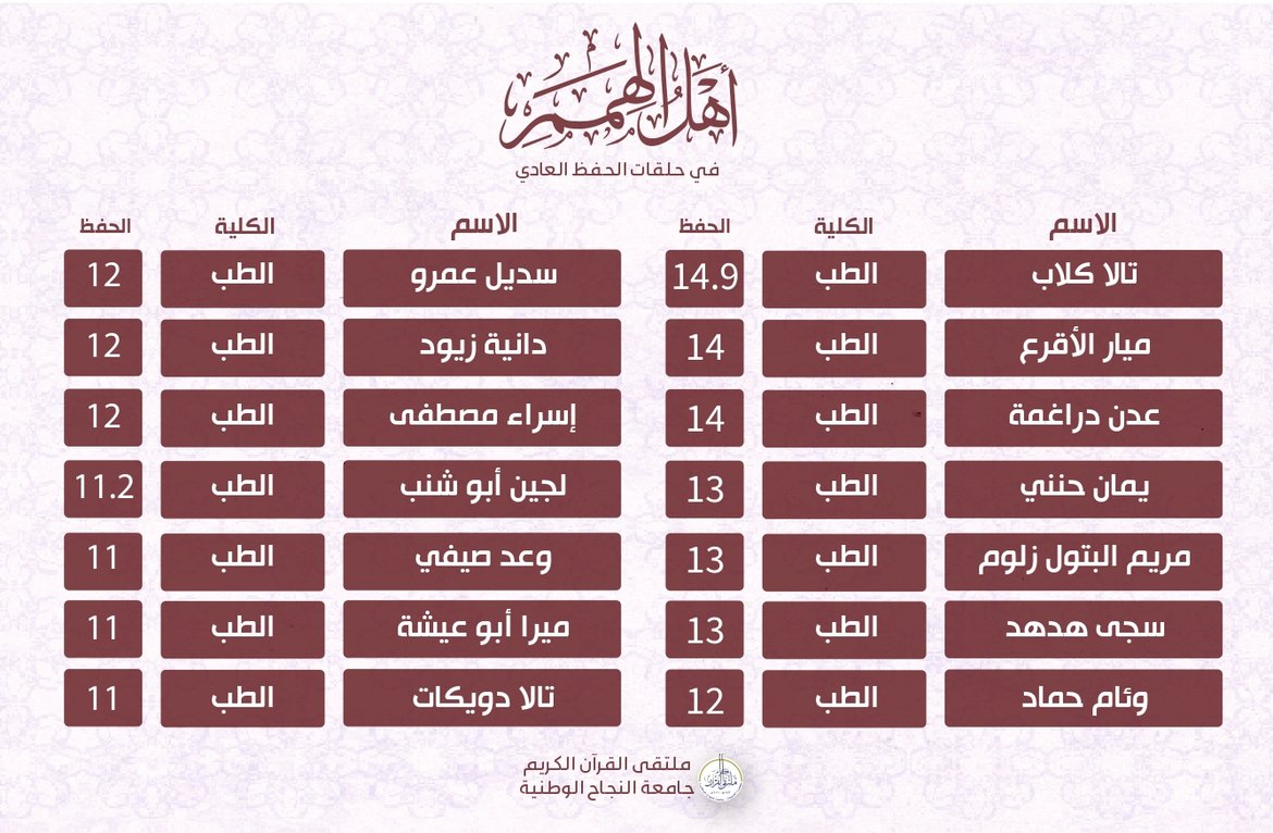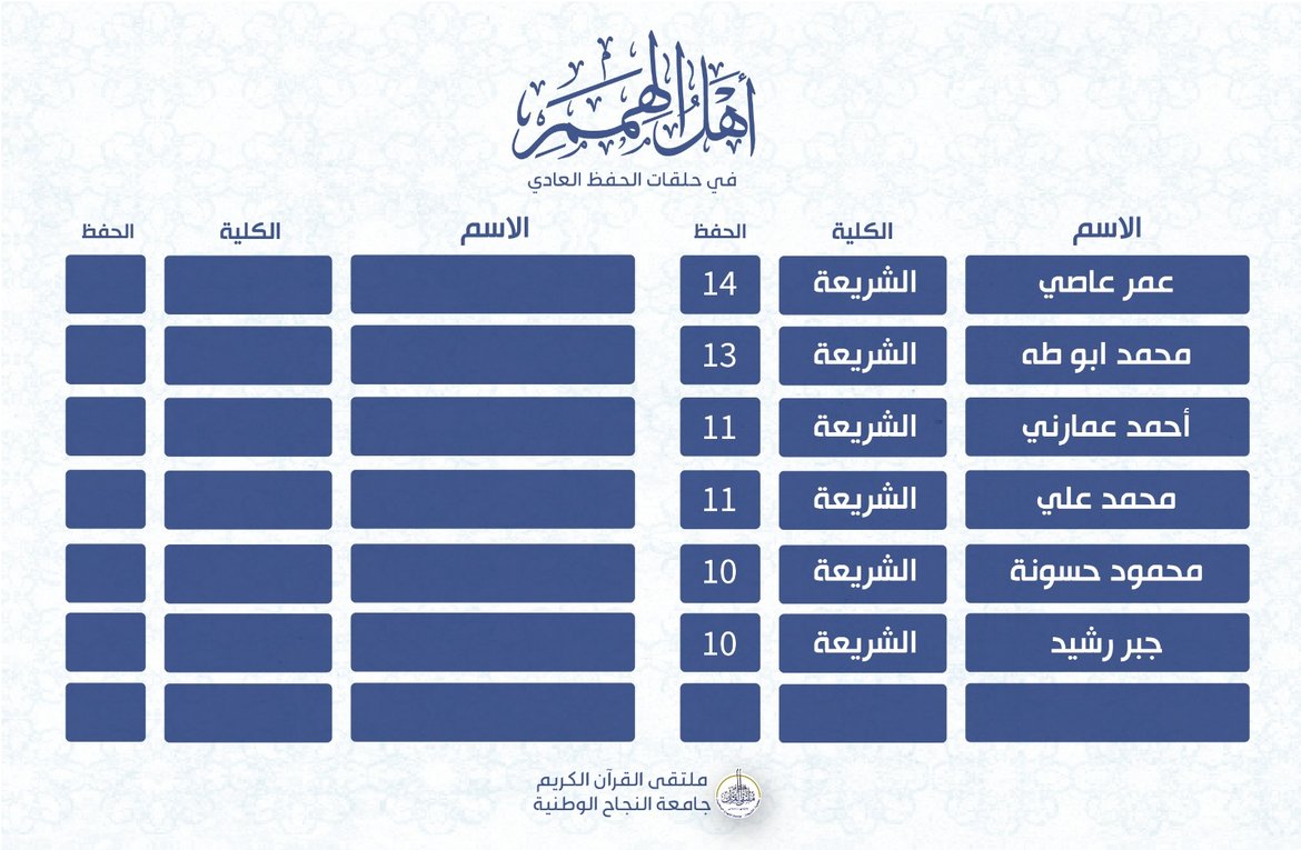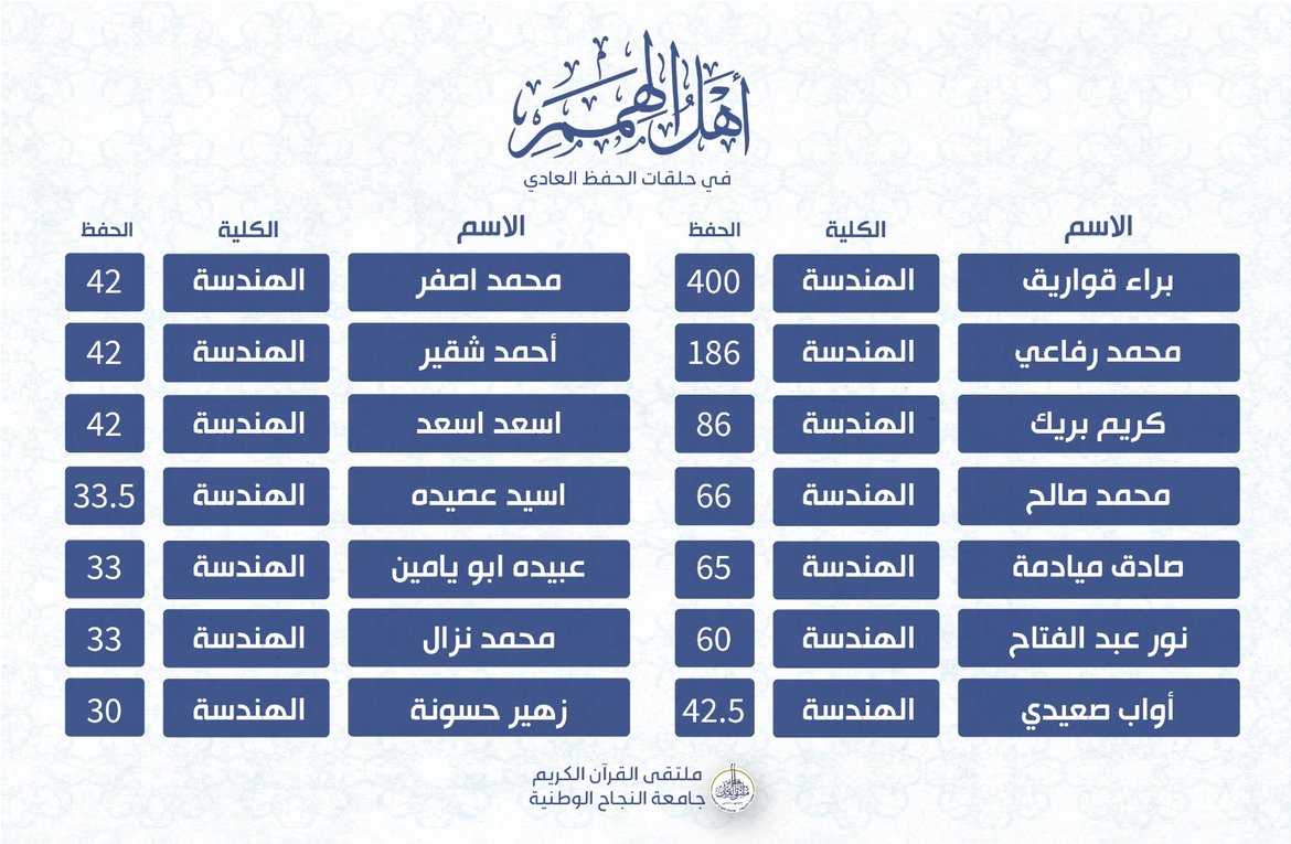 ضمن أنشطة الملتقى الهادفة لرعاية حفظ القرآن الكريم وضمن حلقات التحفيظ، جاءت نتائج الحفظ للأسبوع السّابع من الفصل الدّراسيّ الأوّل للعام 2025-2026 كالتالي: