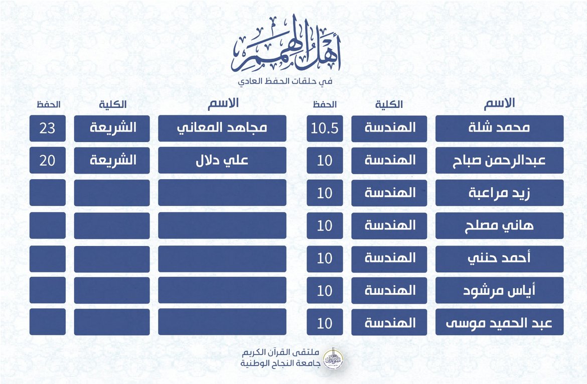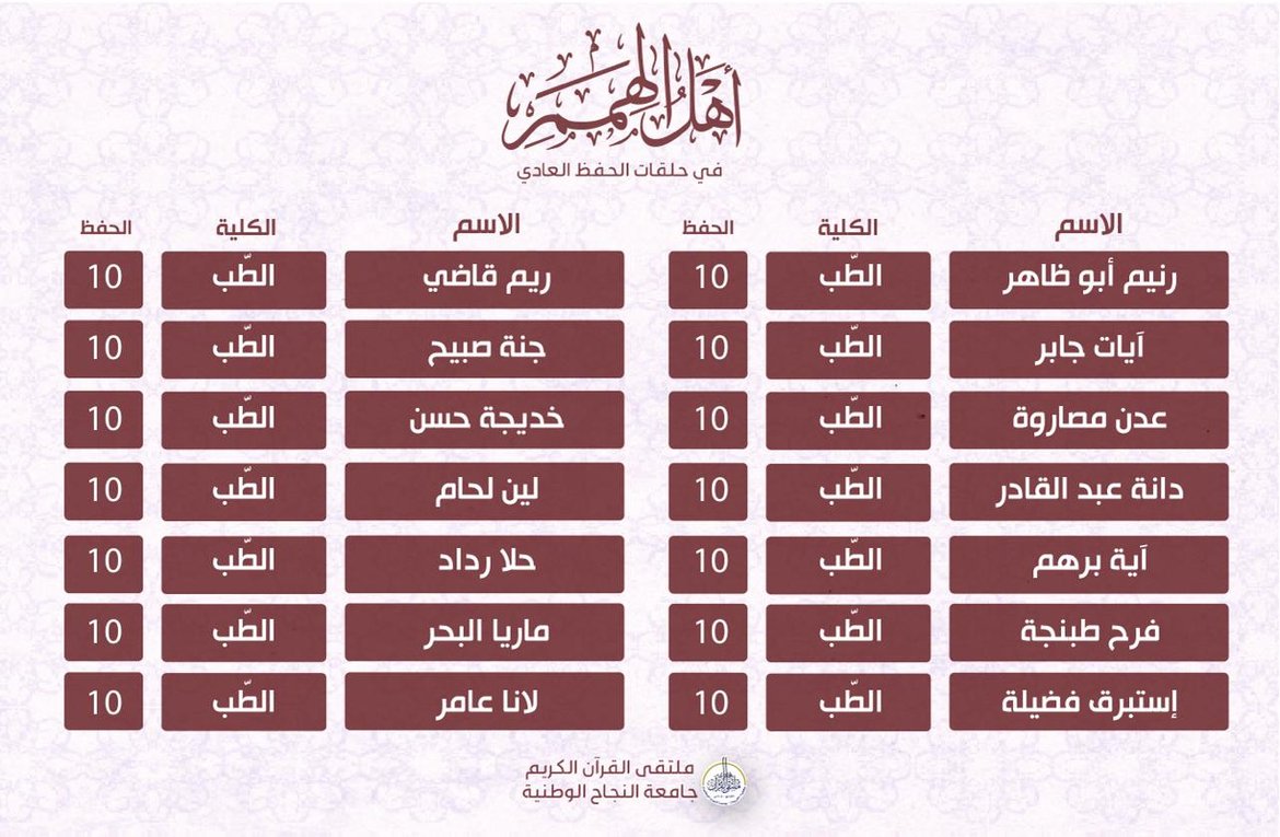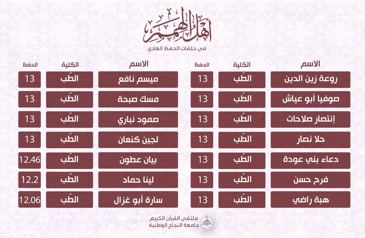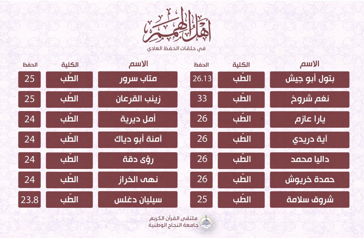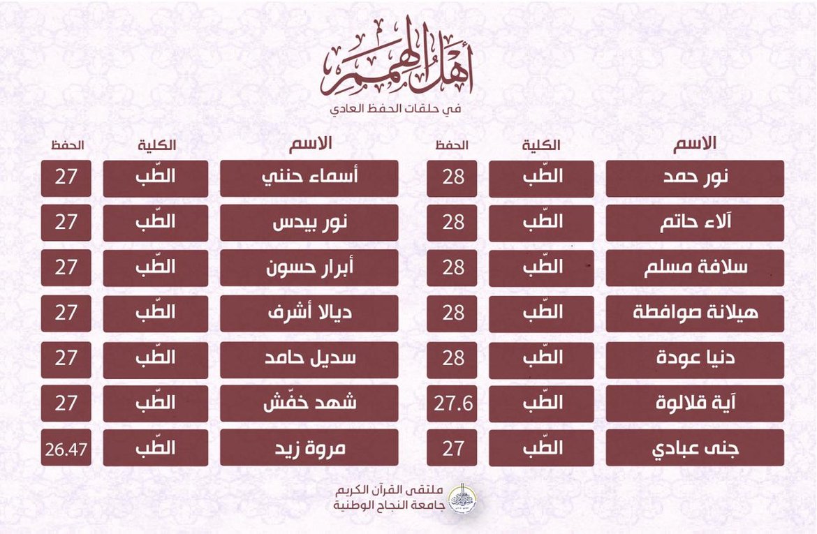ضمن أنشطة الملتقى الهادفة لرعاية حفظ القرآن الكريم وضمن حلقات التحفيظ، جاءت نتائج الحفظ للأسبوع الأوّل من الفصل الدّراسيّ الثّاني للعام 2025-2026 كالتالي: