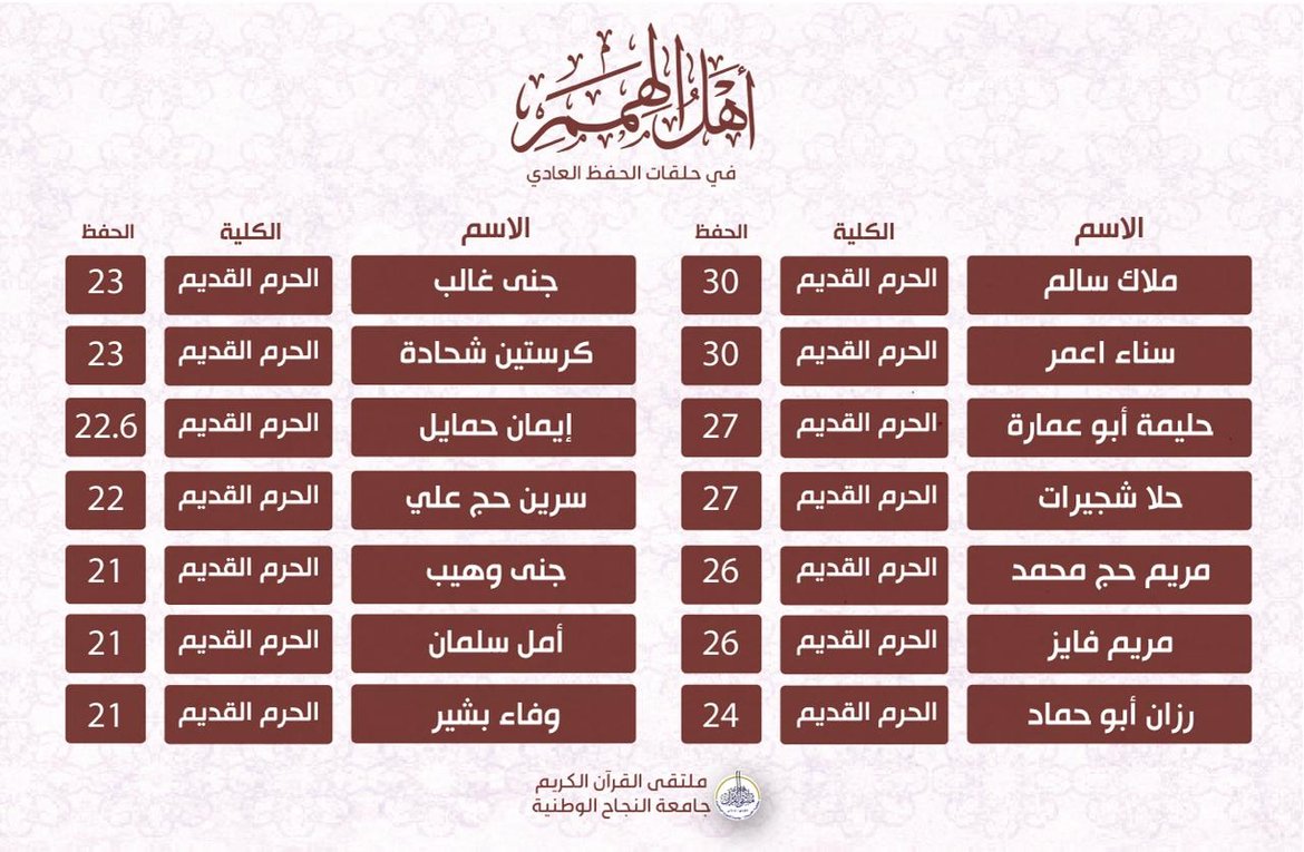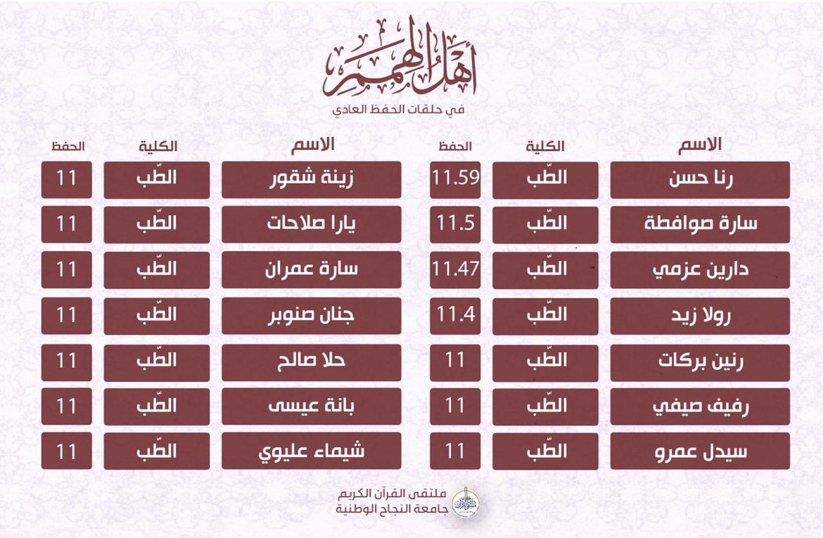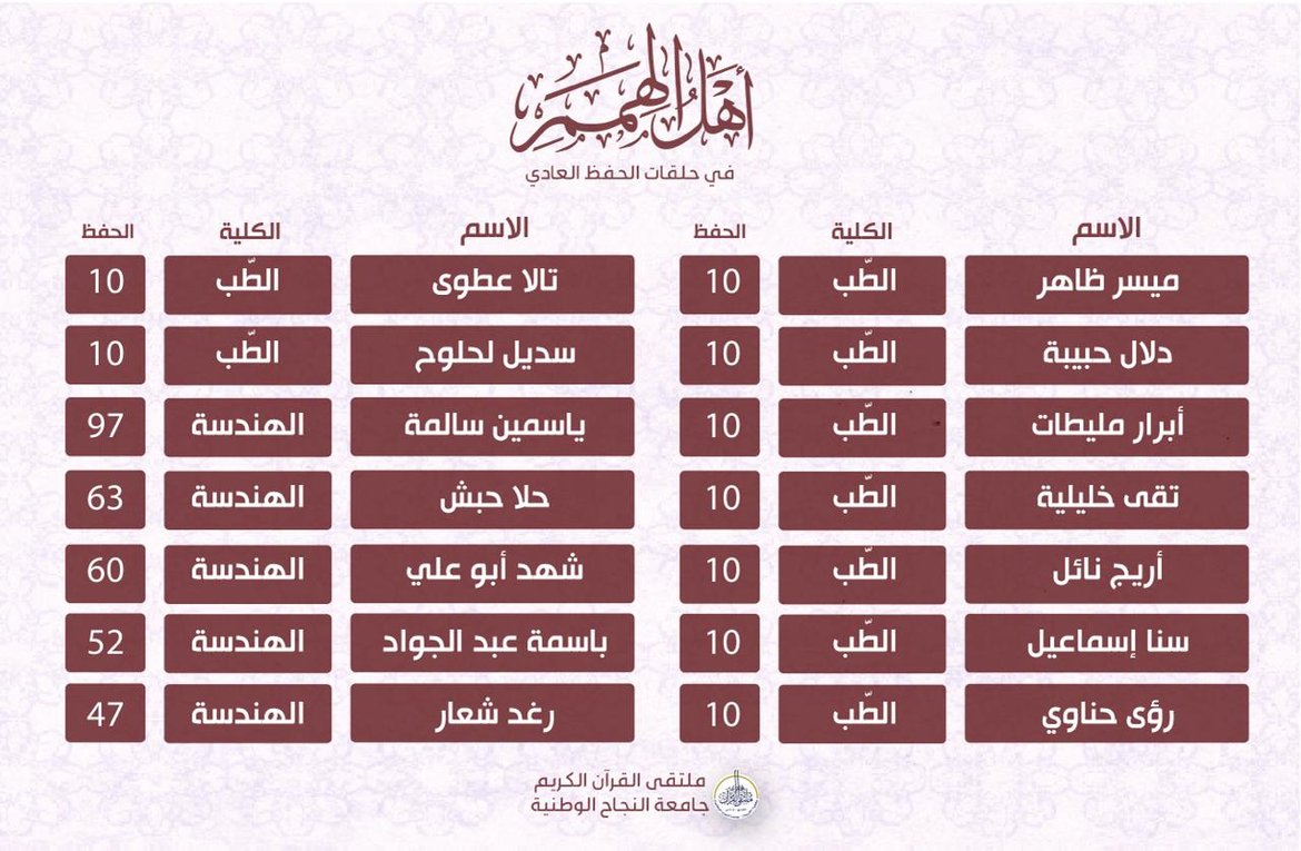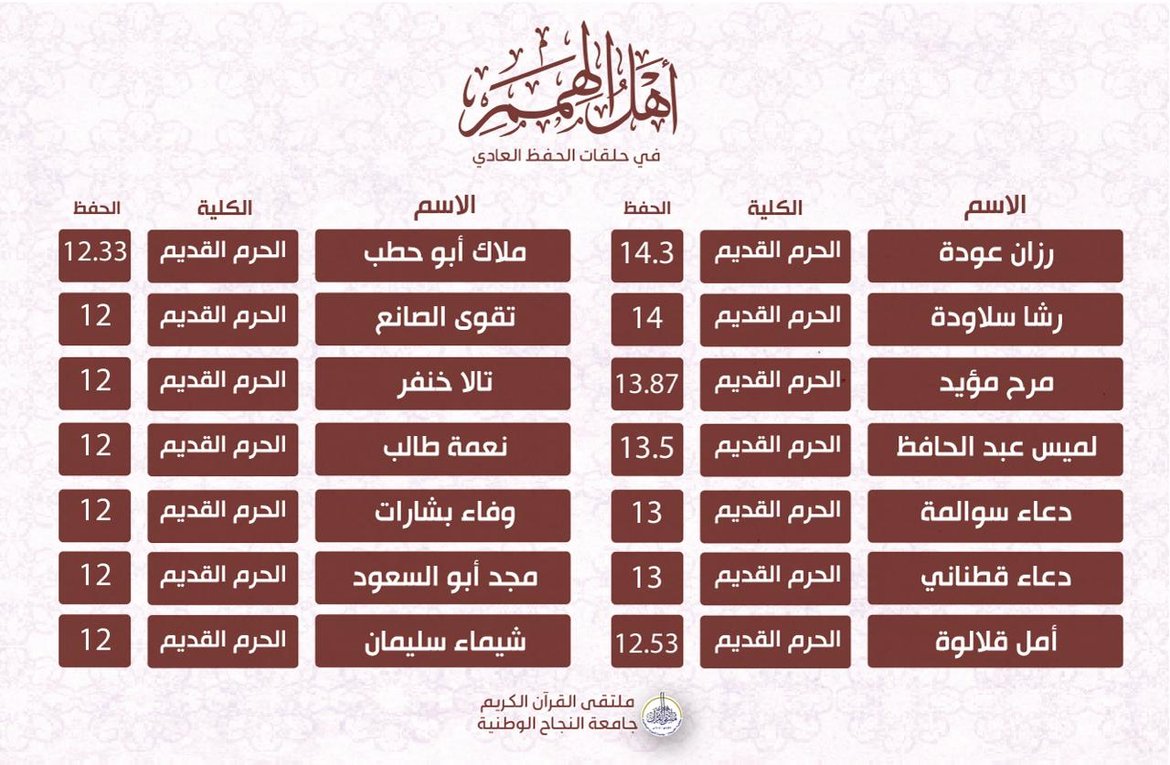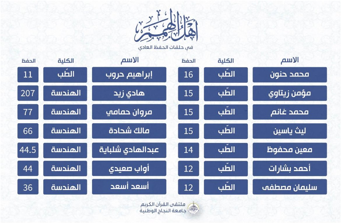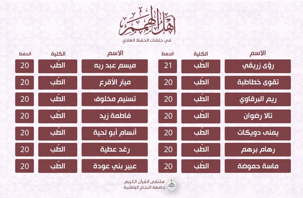 ضمن أنشطة الملتقى الهادفة لرعاية حفظ القرآن الكريم وضمن حلقات التحفيظ، جاءت نتائج الحفظ للأسبوع الأوّل من الفصل الدّراسيّ الثّاني للعام 2025-2026 كالتالي: