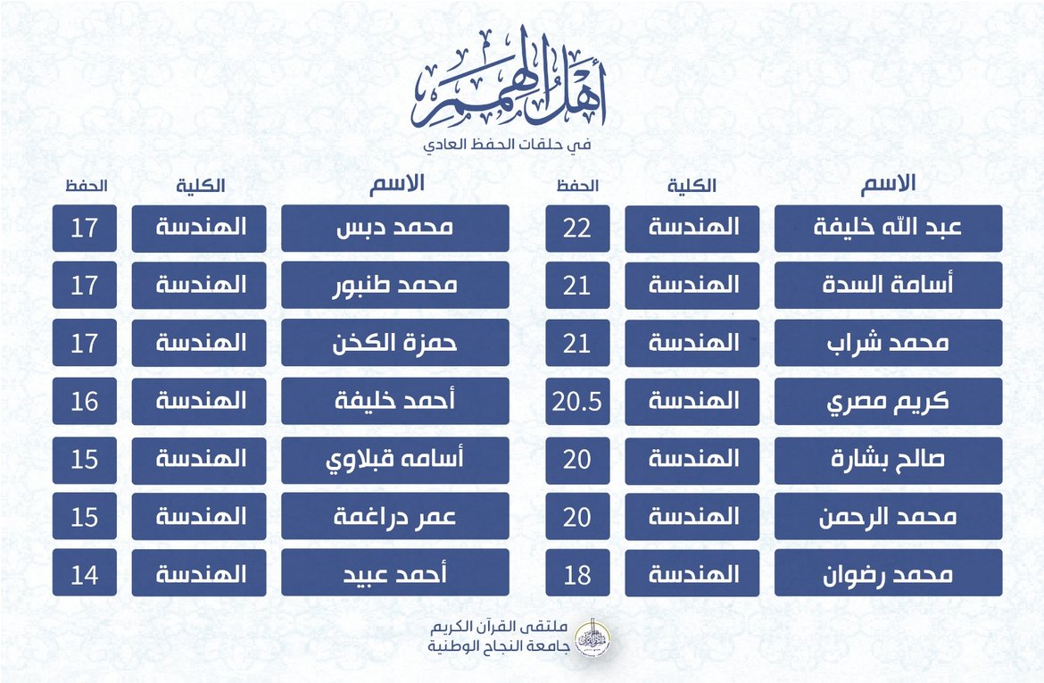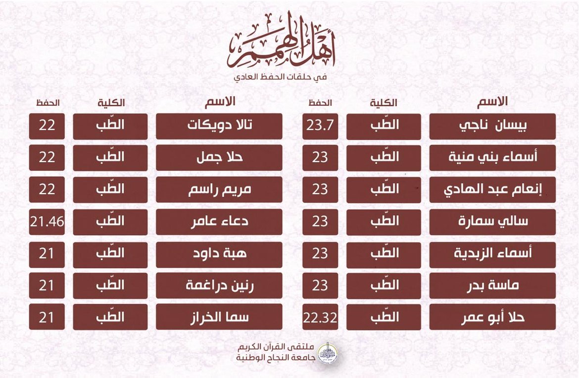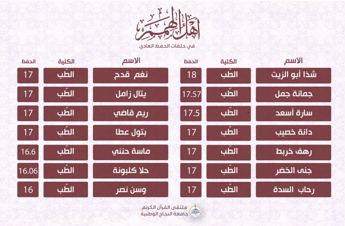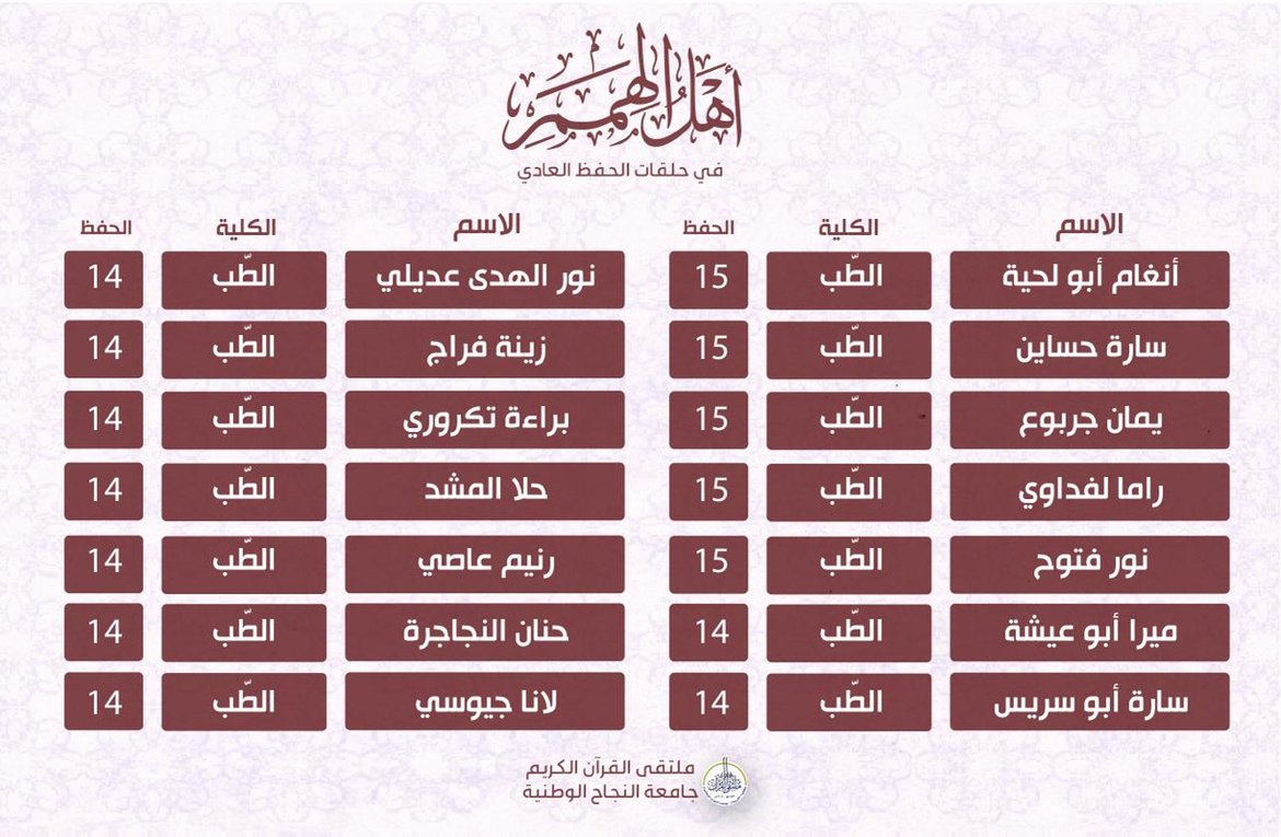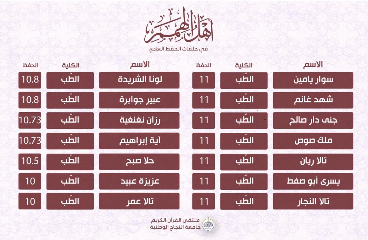 ضمن أنشطة الملتقى الهادفة لرعاية حفظ القرآن الكريم وضمن حلقات التحفيظ، جاءت نتائج الحفظ للأسبوع الأوّل من الفصل الدّراسيّ الثّاني للعام 2025-2026 كالتالي: