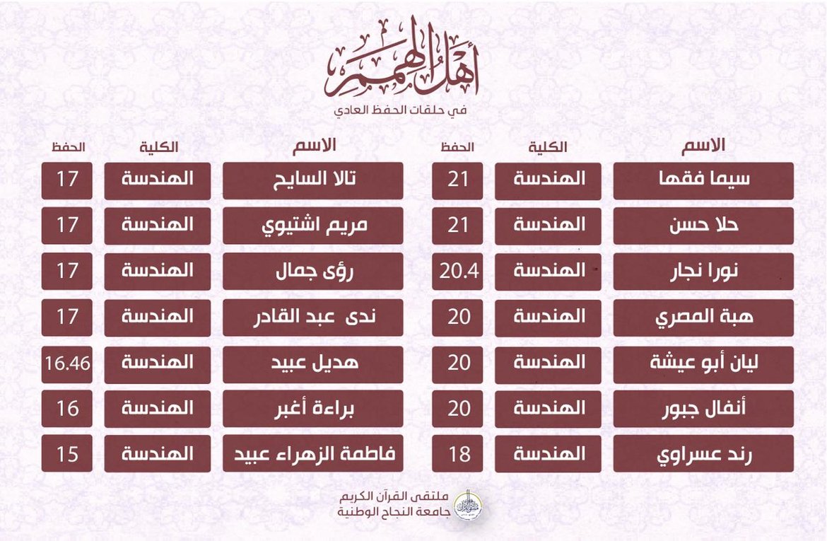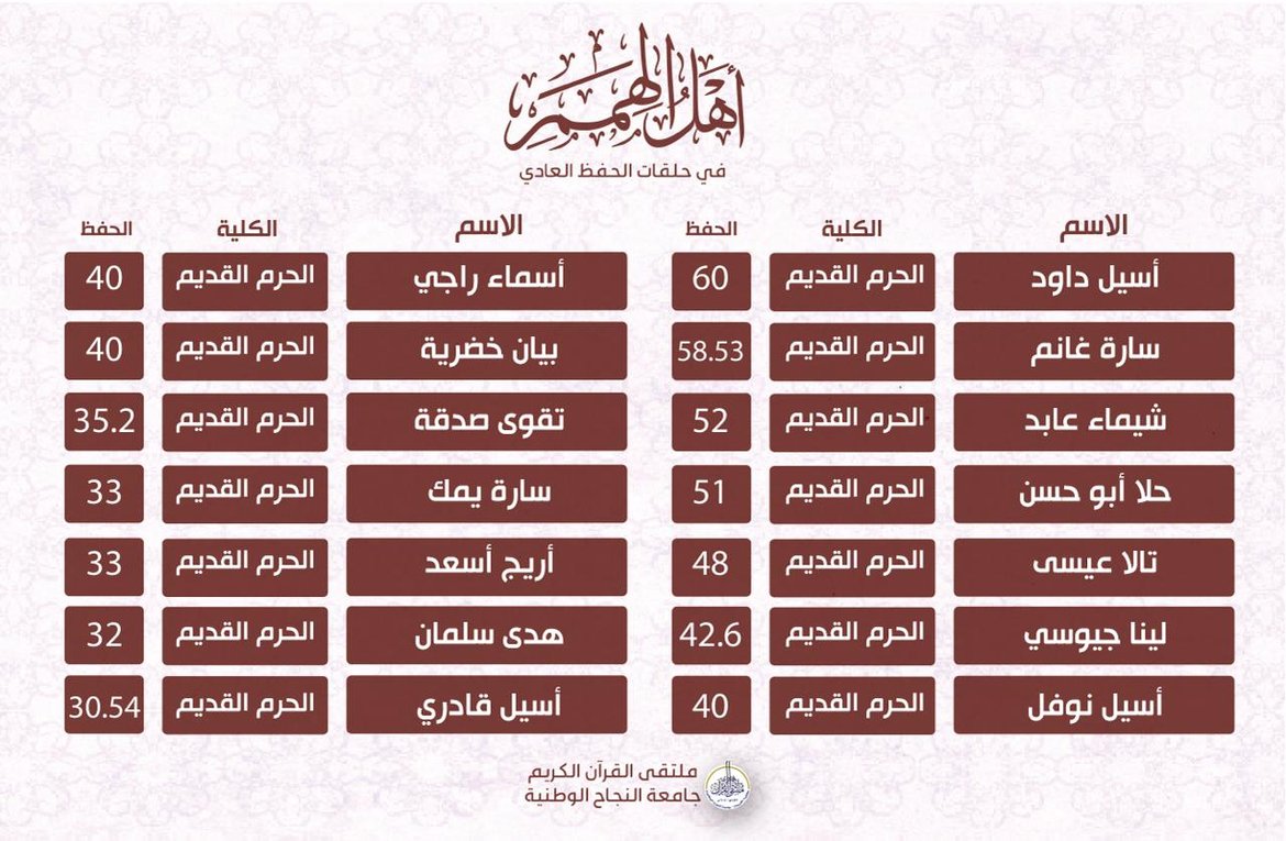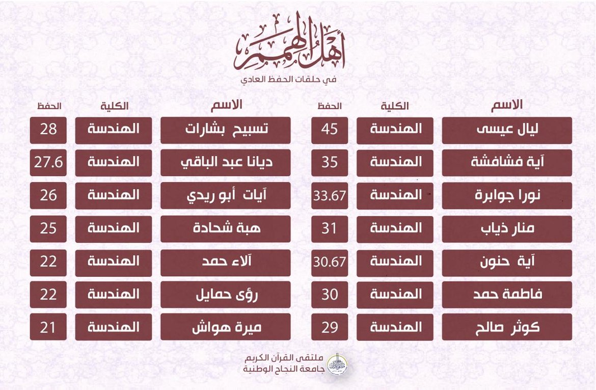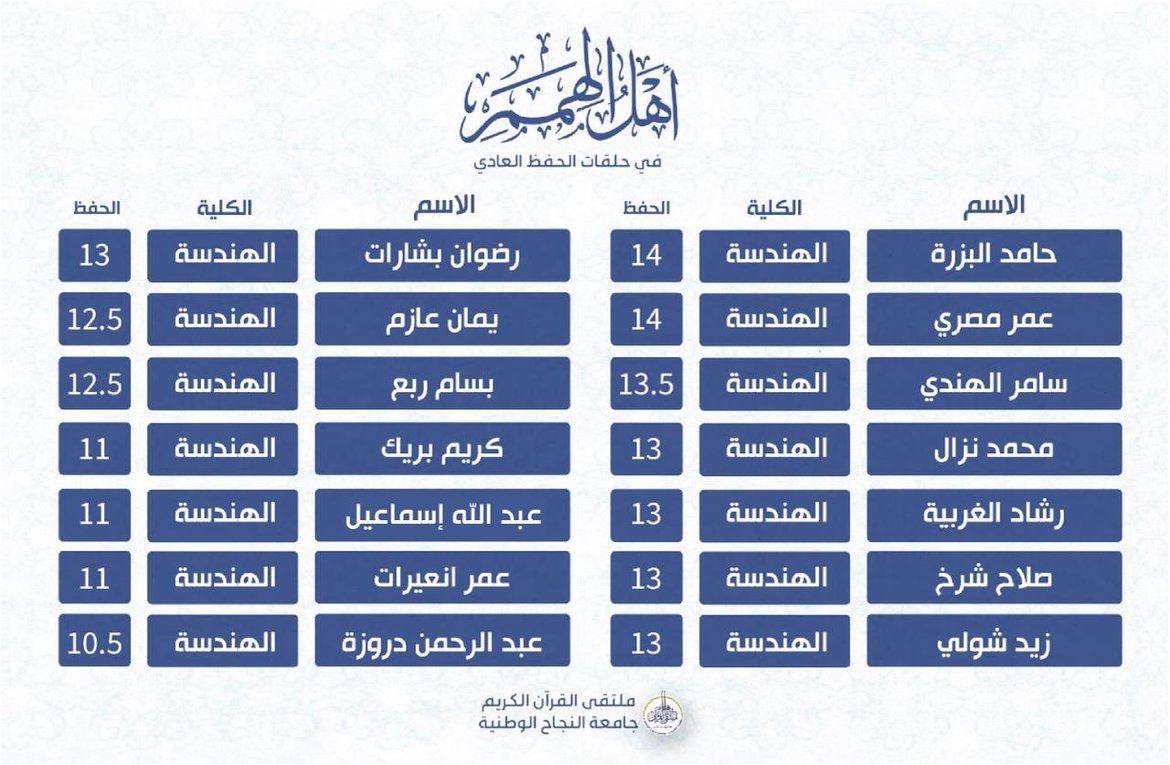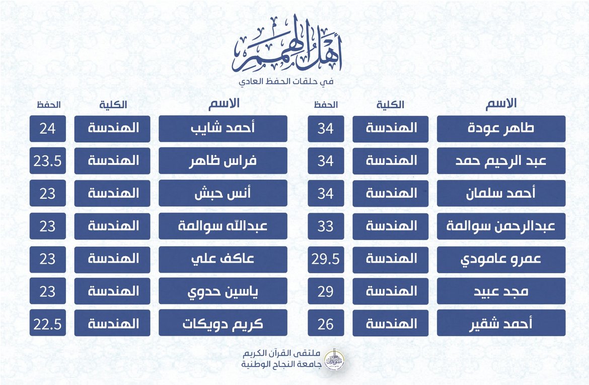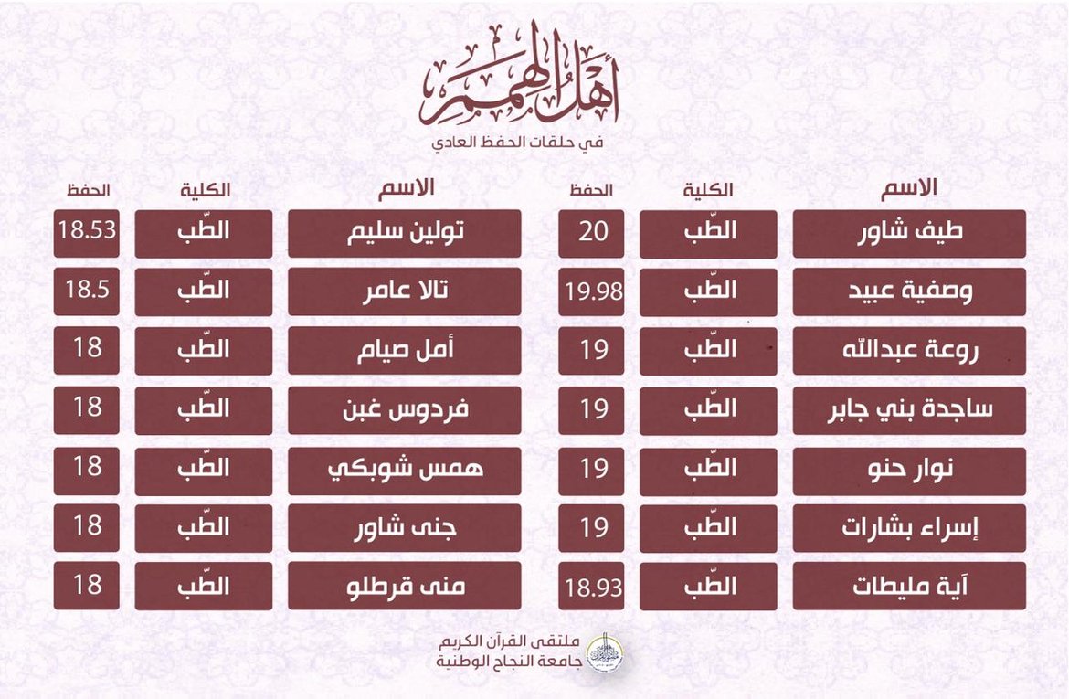 ضمن أنشطة الملتقى الهادفة لرعاية حفظ القرآن الكريم وضمن حلقات التحفيظ، جاءت نتائج الحفظ للأسبوع الأوّل من الفصل الدّراسيّ الثّاني للعام 2025-2026 كالتالي: